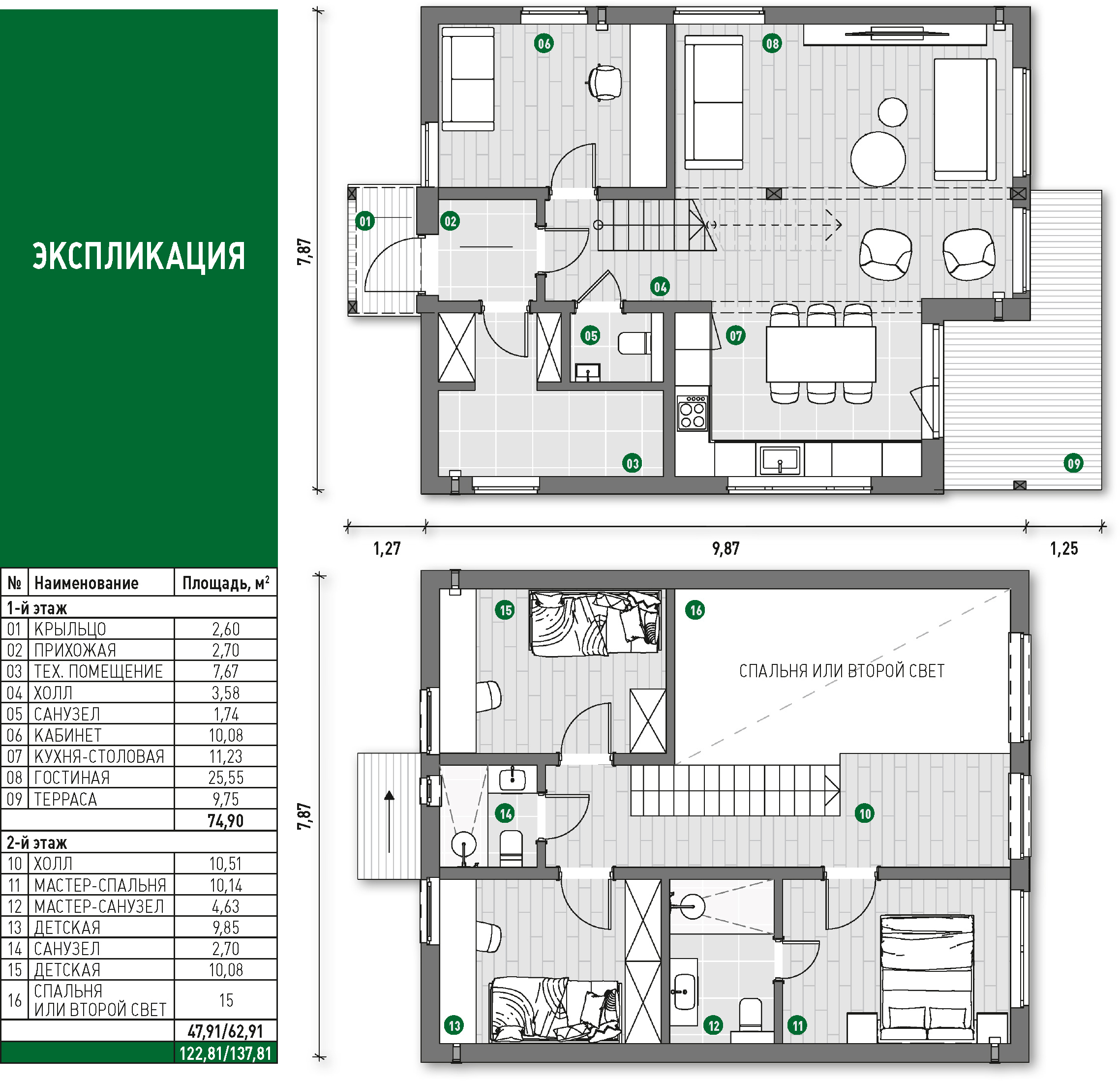 Семейная жизнь требует особого подхода к планировке жилого пространства. И сегодня мы рассмотрим проект двухэтажного дома ТАМАК-110, общей площадью 122,81 м2 и площадью жилых помещений 110,46 м2, который включает прихожую, две спальни, мастер-спальню, техническое помещение (соответствующее требованиям газовых служб), кухню и гостиную. Этот дом можно построить с использованием семейной ипотеки до стадии «предчистовой» отделки, известной как «white box» (белые стены).