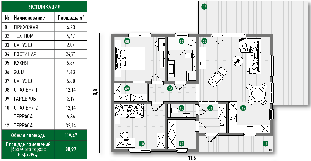 Этот проект – воплощение продуманности и комфорта для современной семьи. Его общая площадь с учетом террасы и крыльца составляет 119,47 м², а площадь отапливаемых помещений – 80,97 м². Несмотря на кажущуюся скромность, внутри вас ждет просторное и рационально организованное пространство.